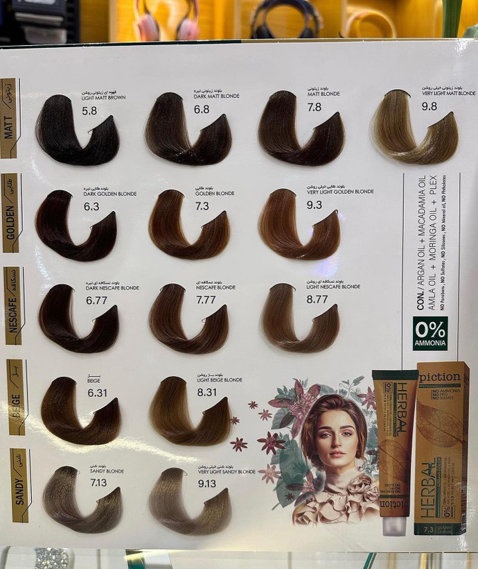 رنگ مو گیاهی پیکشن مناسب برای همه خصوصا خانم هایی که کراتینه کردن موهاشون رو یا خانم هایی که باردارن یا موهای حساسی دارن رنگ مو فاقد آمونیاک، سولفات و بدون حساسیت پیکشن دارای 48 طیف رنگی متنوع است. این محصول به مو های شما آسیب نمی زند و برای موهای حساس مناسب است چون التهاب ایجاد نمی کند این محصول حاوی کراتین، پلکس و روغن های مغذی از جمله آرگان، ماکادمیا و مورینگا است که خاصیت ترمیم کننده و نرم کننده برای مو ها دارند در ترکیبات رنگ مو پیکشن از مونواتانول امین بجای آمونیاک استفاده شده است که می تواند بدون آسیب رسانی، کوتیکول های مو را باز کند و سبب ایجاد و جذب رنگ مو جدید شود با پوشش و جلوه عالی محصولات پیکشن اسپانیا